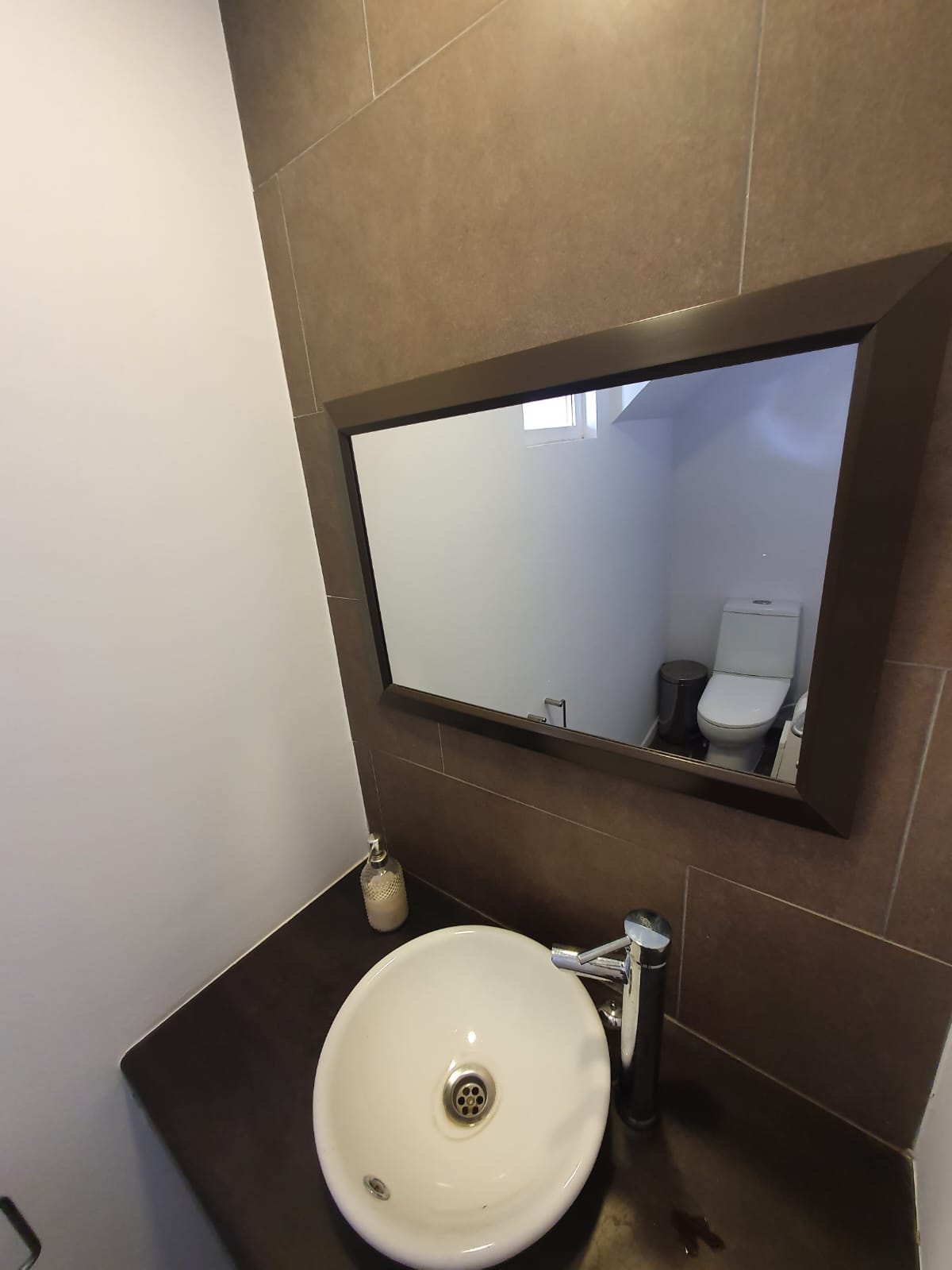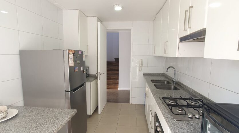 Baño de visita y amplia cocina con muebles, mesón de granito, lavaplatos doble fondo, encimera a gas, horno y extractor. Cuenta además con un pequeño comedor diario.